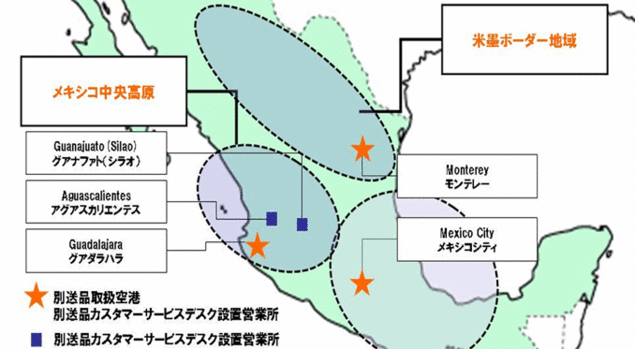 グアダラハラ空港は、自動車産業の進出が著しいメキシコ中央高原地域へのゲートウェイに位置し、また、モンテレー空港は米墨ボーダー地域から至近の立地にある。近年、同地域では、日系企業の新規進出と業務拡張にともない、長期出張者・赴任者が増加している。顧客に最も近い空港で輸入通関を行うことにより、同地域への配達所要日数は、従来と比較して、平均1~2日の短縮が可能となったという。