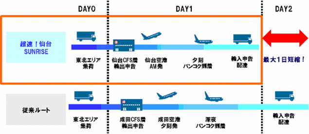 本サービスでは、同社の高速オペレーションと仙台空港新規就航便スペースを活用し、朝7:00までに同社仙台CFSにて受託した貨物を同日午前中の便に搭載することで、前日の緊急出荷に対応でき、東北エリアの顧客にとって、従来に比べ最大一日のリードタイム短縮を実現する。
