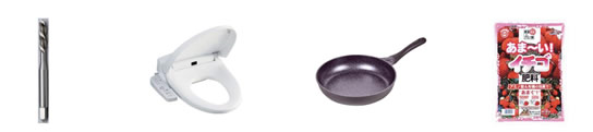 ※左からスパイラルタップ、もっと軽いねマーブルダイヤモンドコートフラパン、あま~い!イチゴ肥料