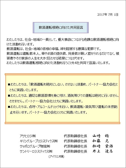 アサヒロジ㈱、キリングループロジスティクス㈱、サッポログループ物流㈱、サントリーロジスティクス㈱ の4社は7月11日、飲酒運転根絶に向けた共同施策を行うと発表した。