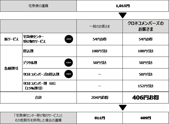 利用方法:荷物の受取場所を自宅などでなく宅急便センターに指定して発送すると宅急便の運賃(税込)が54円お得に