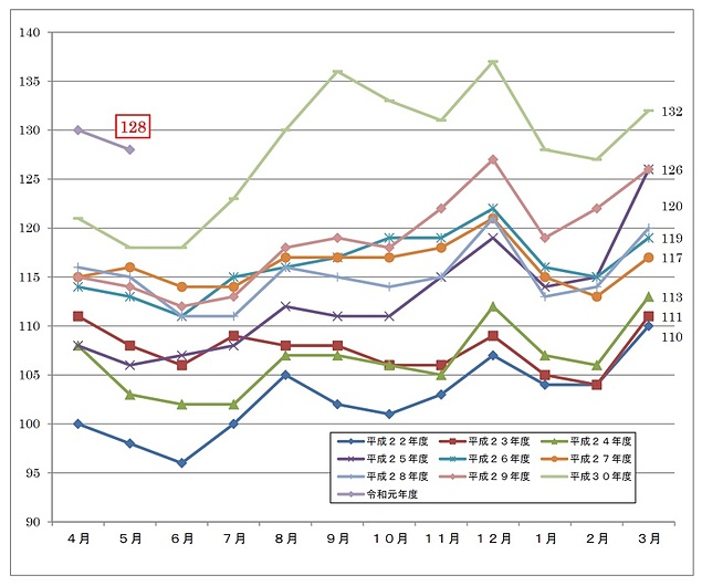 (公社)全日本トラック協会と日本貨物運送協同組合連合会は6月6日、令和元年5月分の求荷求車情報ネットワーク(WebKIT)成約運賃指数が前月比2ポイント減、前年同月比10ポイント増の128になったと発表した。