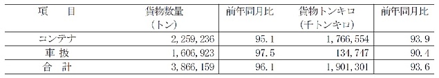 これによると、鉄道貨物輸送量の貨物数量総合計は387万t、前年同月比3.9%減、貨物トンキロ総合計では、19億t・km、前年同月比6.4%減減だった。