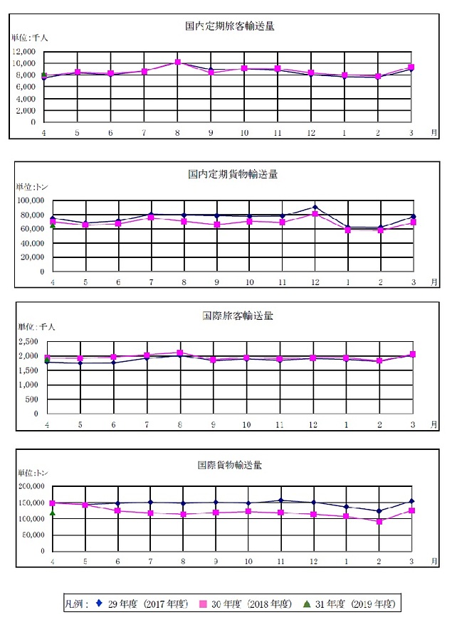 国土交通省は6月28日、平成31年4月分の航空輸送統計速報を以下の通り発表した。なお、貨物輸送の( )内は超過手荷物、郵便物を含む数値。国内定期航空輸送実績にはコミューター航空輸送実績が含まれる。