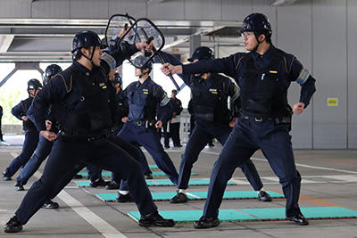 ソフト警戒棒や刺又(さすまた)等を使用した実技訓練のほか、合気道・空手道を取り入れた護身術、救急蘇生法の訓練など、警備員として必要な知識・技能の向上に向け、熱のこもった訓練を行った。
