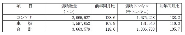 これによると、鉄道貨物輸送量の貨物数量総合計は366万t(前年同月比18.6%増)、貨物トンキロ総合計は18億t・km(前年同月比35.7%増)となった。