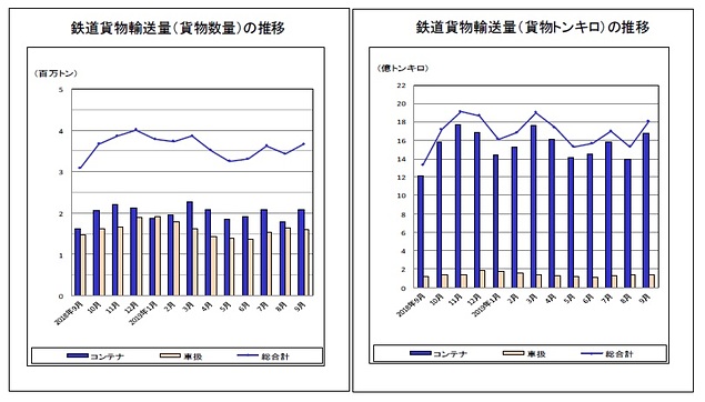 9月の鉄道貨物輸送量は前年同月比18.6%増に