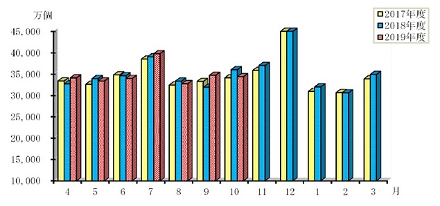 調査対象14社の10月の宅配便貨物の取り扱い個数は、約3億4,381万7,000個で、前月比約345万2,000個減少したため、前月比99.0%(季節調整済み 93.4%)となり、前年同月比約1,628万6,000個減少したため、同95.5%の実績であった。