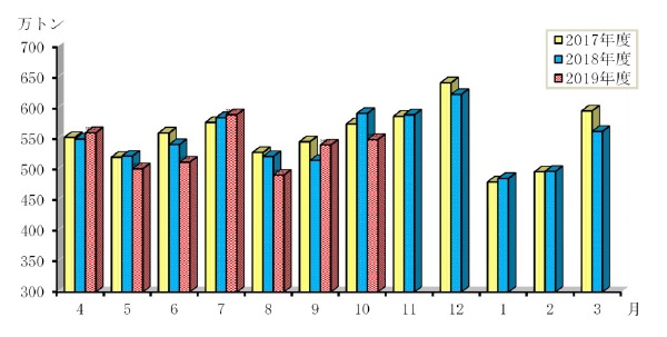調査対象24社の10月輸送量は549万897tで、総輸送量が前月比約8万7,000t増加したため、同101.6%(季節調整済み91.3%)となり、前年同月比約42万8,000t減少し、同92.8%の実績となった。