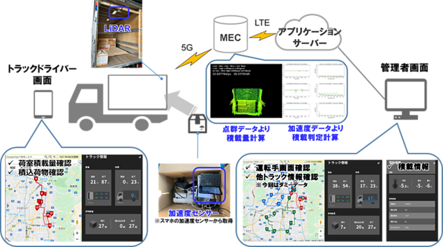 トラックの荷室の空き状態を可視化するため、LiDARで取得した荷室の点群データ(※2)を「おでかけ5G」の端末を用いて、トラックと遠隔地にいる管理者へ伝送しました。5Gの大容量通信とMEC※3サーバーを活用することで、荷室の点群データのリアルタイムな伝送・解析が可能になり、管理者画面で積載状況を可視化することができました。また、高頻度でデータを伝送するセンサーを荷物に取り付けて、センサーの加速度データおよび位置情報データを基に、荷物が荷室へ積み込まれたかどうかを判定する検証を行いました。今後、積載率の低いトラックを可視化して空いているスペースの有効活用の検討が可能になることや、ドライバーによる積載状況の確認作業を省力化することが期待されます。