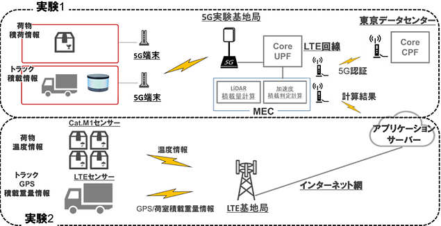 このような課題やニーズに対して、WCPと日本通運はソフトバンクが開発した「おでかけ5G」(高い通信品質のサービスを局地的に提供できる可搬型5G設備)のネットワークを活用して、LiDAR(レーザースキャナ)(※1)によるトラックの積載状況の可視化や加速度センサ等による荷室への積み込みを判定する実証実験を実施。また、Cat. M1等を活用して、荷物の温度状態および積載重量を確認する実証実験も行った。今回実施した実証実験の詳細は以下の通り。