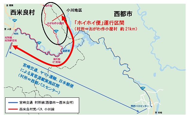 西都市~西米良村(村所驛)間では、宮崎交通株式会社(以下「宮崎交通」)とヤマト運輸、日本郵便による貨客混載が既に実施されており、ホイホイ便の運行開始により、西米良村は複数の貨客混載を運行する地域となる。