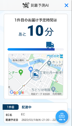 ウェブサイトで注文後、配送が始まると、購入客は「Scatch!」のマイページで配送車両の位置情報をリアルタイムに確認することが可能。また、「Scatch!」のスマートフォン専用アプリで、AIが予測した到着までの残り時間を確認することもできる。