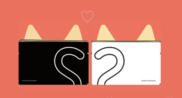●箱の上面を入れ替えると送り状を貼っていた面が隠れるため、自宅の小物入れ等として利用い可能(上)、「ネコ耳BOX(黒)」と「ネコ耳BOX(白)」を並べるとしっぽがハートマークになるデザインを採用(下)