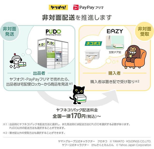 ※1:「ヤフオク!」、「PayPayフリマ」で落札された商品を発送する際、ヤマト運輸が提供する「宅急便」「宅急便コンパクト」「ネコポス」の各サービスを、リーズナブルな全国一律料金で利用できる配送サービス。