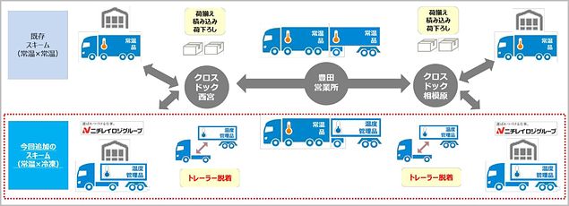 本運行は、NLJのパートナー企業であるニチレイロジの荷物を積んだ専用冷凍トレーラーを、NLJの中継拠点であるクロスドックでフルトラクターと連結し、相模原センターから西宮センター間をダブル連結トラックで輸送する。トラクターとトレーラーの脱着作業のみで同時輸送が可能となるため、各センターでの荷役作業や待機時間の削減によるドライバー負荷の大幅な低減が期待できる。