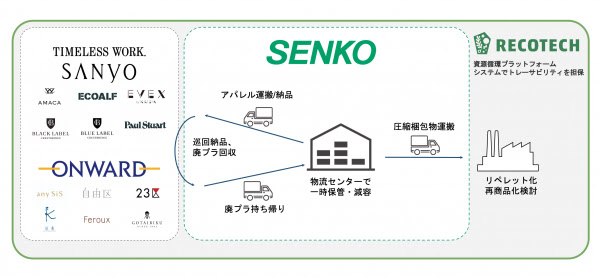 (株)オンワード樫山と(株)三陽商会は7月27日、両社の納品物流業務を担うセンコーグループホールディングス(株)と協働し、動静脈一体物流を活用して効率的に廃プラスチックを回収し再生するレコテック(株)の資源循環プラットフォーム実証事業に参画したことを明かにした。