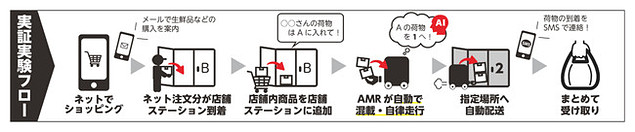 今回の実証実験ではAMRとしての性能検証にとどまらず、中山間地域での物流の利便性を確保しながら、AMRを新たな買い物支援として運用するための収益モデルの検証も行う。実証実験フィールドは北広島町の役場本庁、および(株)コムズ運営のショッピングセンター「サンクス」周辺となる。