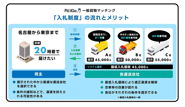 CBcloud(株)は11月29日より、一般貨物事業者(運送会社)が配送マッチングプラットフォーム「PickGo」上で、配送条件等に応じて個別に配送料金を提示して案件にエントリーする「入札制度」を導入し、運用を開始した。