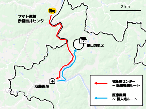 医療用医薬品等の商品を医薬品卸ティーエスアルフレッサの物流拠点からヤマト運輸が集荷し、ドローンにより赤磐吉井センターから医療機関(渋藤医院)への輸送、さらにオンライン診療・服薬指導後の処方薬を調剤薬局(林薬局)から患者宅までドローンで輸送した。