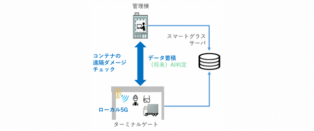 コンテナダメージチェックにおいて、ゲート作業員が判断できない場合に有スキル者が管理棟から駆け付けて確認作業を行っているところ、この時間を削減し、ゲート作業を効率化するため、ゲート作業員がスマートグラス(眼鏡型カメラ)を装着することにより、有スキル者によるダメージチェックを遠隔化できるか確認するほか、将来のダメージチェックのAI判定に向けてダメージ画像データを蓄積する。