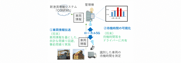 周辺道路の渋滞解消に向けて、コンテナターミナルに来場する外来トレーラーを2台(周辺道路とコンテナターミナルゲート前に設置)の4Kカメラで常時撮影し、車両情報(ナンバー)を自動で取得することにより、待機時間の可視化及び渋滞予測が将来的に実現できるか確認するほか、コンテナターミナル内での積荷時間の削減に向けて、事前荷繰りに必要な車両情報を「CONPAS※4」へ円滑に伝送できるか確認する。