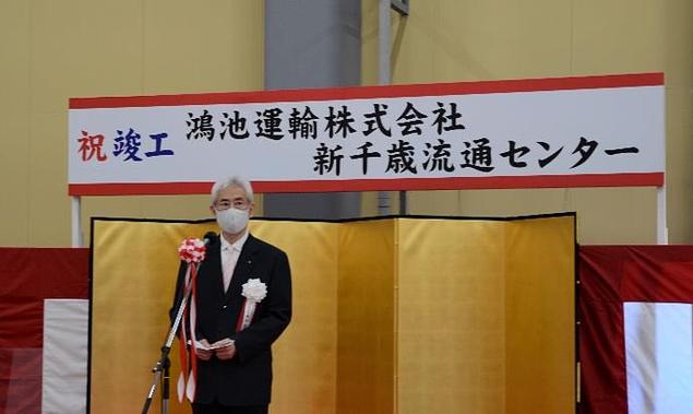 ●新千歳流通センターの外観(上)、倉庫内に設置したバース(中)、竣工式の様子(鴻池社長の挨拶)(下)