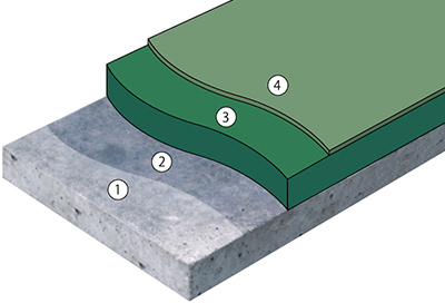 ●無機系速硬耐久塗り床材の工法図(仕上げ厚の目安:約5~10mm ①下地、②プライマー、③主材塗り付け、④トップコート)