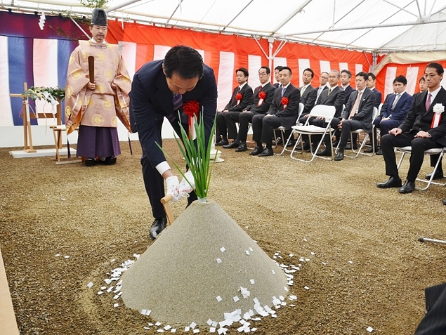 起工式には、設計・施工を担当する西松建設(株)代表取締役社長の近藤晴貞氏ほか関係者一同、GLP代表取締役社長の帖佐義之氏らが参列し、安全を祈願した。