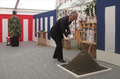 (下)起工式で鍬入れをする関谷代表取締役社長
