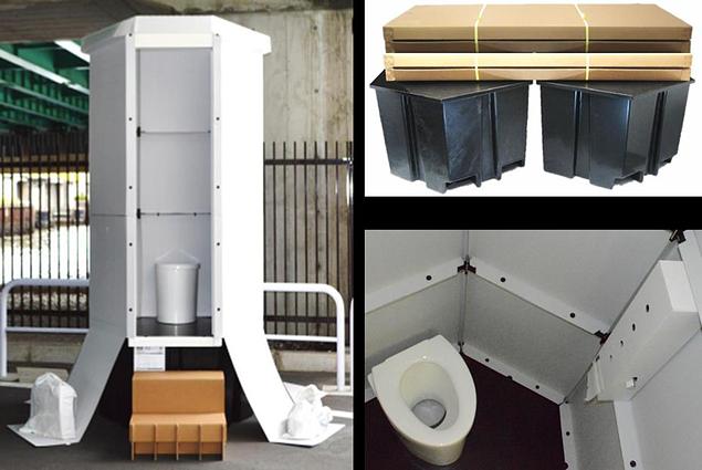 ●備蓄型組立式仮設トイレ「ほぼ紙トイレ」組立後(左)、同組立前(右上)、同組立後室内(右下)