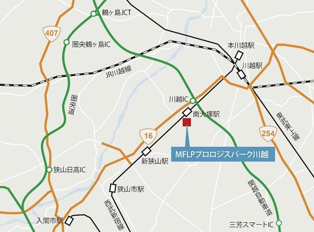 「MFLPプロロジスパーク川越」の立地は、最寄りの関越自動車道川越ICから車で約7分の場所に位置する。東名・中央・関越・東北道といった主要高速道路へのアクセスに優れ、都心と全国各方面を効率的に結ぶ輸送ポテンシャルの高い立地。さらに西武新宿線南大塚駅からも徒歩6分と通勤利便性に優れ、人材確保にも有利な立地となる。