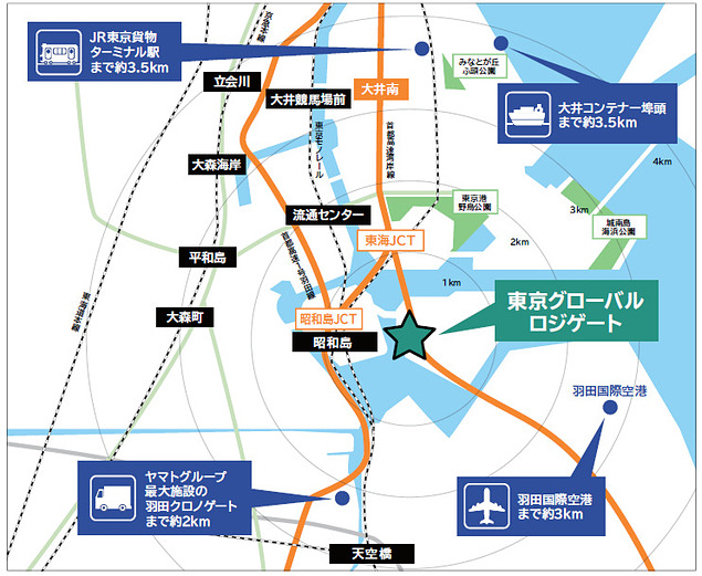 近隣には東京港(大井コンテナ埠頭)や東京国際空港(羽田空港)、JR貨物の東京貨物ターミナルが4km圏内にあるほか、ヤマトグループのスピード輸送ネットワークと高付加価値機能を融合したグループ最大の総合物流ターミナル「羽田クロノゲート」とは約2km、特殊梱包等で顧客の本業特化を支援するヤマトパッキングサービス(株)の「京浜島流通トリニティセンター」とは隣接した絶好の立地を活かし、高効率かつ高品質な物流を実現する。