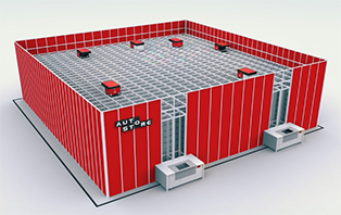 ●(株)オカムラが提供するロボットストレージシステム「オートストア」(上)、(株)フジテックスが提供する(株)ギークプラス製自動搬送ロボット「EVE」(下)