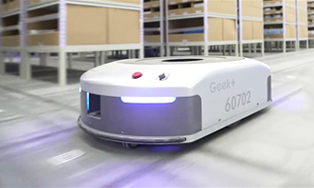 ●(株)フジテックスの設計施工による(株)ギークプラス「自動棚搬送ロボット:EVE」(上)とEVEを活用した作業イメージ(下)