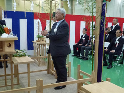 ●「福岡中央ロジスティクスセンター」外観(上)、玉串奉奠を行う日通・関根執行役員(下)