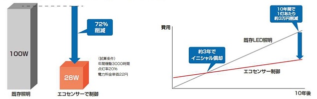 ●「エコセンサー」(上)、既存LED照明比70%の省エネ効果を実現(下)