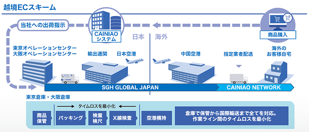 SGHグローバル・ジャパンと菜鳥は輸出入に必要なシステム連携を行い、5月26日から物流業務を開始。現在、大阪から週6回の航空便にて日本から中国まで輸送しており、6月18日以降は2021年に本格稼働したSGHグループの次世代型大規模物流センター「Xフロンティア」内にある東京倉庫からの出荷も計画している。これにより菜鳥が手がける日本から中国の消費者向け直送物流(越境EC「Tモールグローバル」のTモール海外フルフィルメント※)をSGHグローバル・ジャパンが受託する。