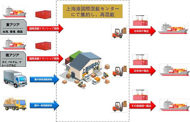 上海における国際混載トランシップサービスは、スペースの確保が難しい仕向地への出荷がある顧客へ、世界各国で500以上の航路がある上海の港を活用し、東南アジアをはじめとした各国からのトランシップ貨物と中国国内の輸出貨物を効率的に積載することで、リードタイムの短縮とコストの低減を実現するサービス。従来、上海でトランシップ(コンテナを積み替え、再混載を仕立てる)する場合、フォワーダーの保税倉庫で積み替え作業を行う必要があり、貨物の移動と、税関手続きに時間がかかっていた。NX中国は、SIPGLと協業し、フォワーダーの保税倉庫を経由せずに上海CYに隣接するSIPGLの専用倉庫を利用する新たなトランシップサービスを開発。トランシップに関わるリードタイムの短縮とコストの低減が可能となった。