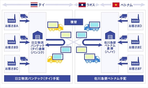 今回、タイ・ラオスの国境に両社の貨物積み替え拠点を設け、日立物流バンテック(タイ)がタイ国内輸送を、佐 川急便ベトナムがベトナム国内およびベトナム・ラオス間輸送を担う新たな共同配送ルートを確立。タイ・ラオス国境でコンテナごとそれぞれの車両へ積み替え、新たな貨物を載せた車両が各社の拠点まで輸送する。