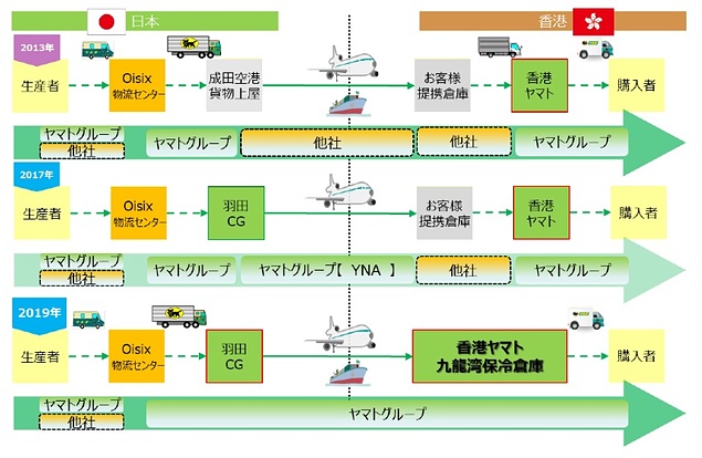 Oisix 香港は2009年12月より日本の食品・食材を香港の消費者にお届けするサービスを開始し、2017年7月からは羽田クロノゲートと香港空港間でYNAを活用した輸送を進めてきた。その一方で、独自の安全基準 に則った農産物、加工商品などの日本の食品・食材を定温管理できる倉庫のキャパシティ増強、今後香港でさらなる事業拡大の実現を目指す上で、高品質な物流ネットワークの構築が喫緊の課題となっていた。 その解決のため、香港ヤマトが約300坪拡張した九龍湾基地の保冷倉庫を活用した国際一貫保冷輸送を開始した。