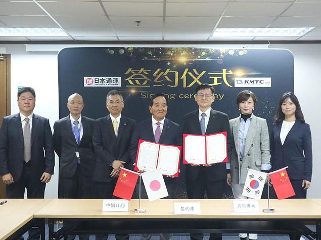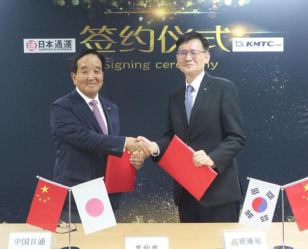 日本通運(株)は4月27日、中国現地法人の日通国際物流(中国)有限公司(中国日通)が高麗海運(KMTC)の中国本社となる高麗海運(上海)有限公司と4月13日にドア・ツー・ドア一貫輸送サービスの商品化を目的とした覚書を締結した。