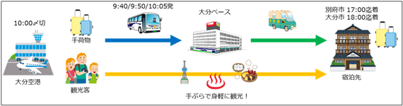 (1)大分航空ターミナルのスタッフが大分空港の荷受カウンターで10:00までに手荷物を預かり、大分交通が大分市内行きの空港リムジンバスのトランクへ手荷物を格納して大分市内へ向かう。