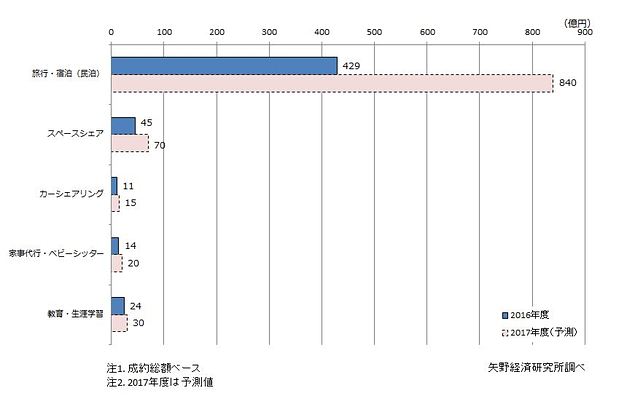 一方、2017年度の物販分野全体のCtoC市場規模は流通総額ベースで9,950億円と予測。サービス分野のCtoC市場規模は、成約総額ベースで旅行・宿泊は840億円、スペースシェアは70億円、カーシェアリングは15億円、家事代行・ベビーシッターは20億円、教育・生涯学習は30億円と予測している。