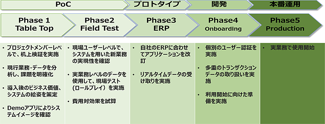 受発注・入出荷などの既存業務の課題解決や効率化に向けた業務コンサルテーションを実施。その上で、NTTデータのブロックチェーンソリューションを活用したデモアプリケーションを構築し、実現性や効果を確認・検証しながら段階的にプロトタイプ開発から本番適用へと進めていく。