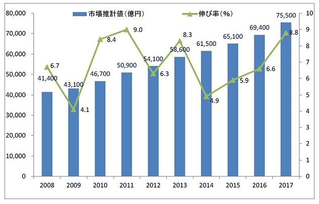 金額ベースで前年比6,100億円の増加。マイナス成長を記録した1998年度以来、19年連続して増加傾向で、直近10年の平均成長率は6.9%を達成している。