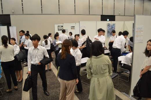 続いて、参加企業33社が構えるブースに学生が自由に訪問できる業界研究セミナーが全7クール(1クール30分間)行われた。