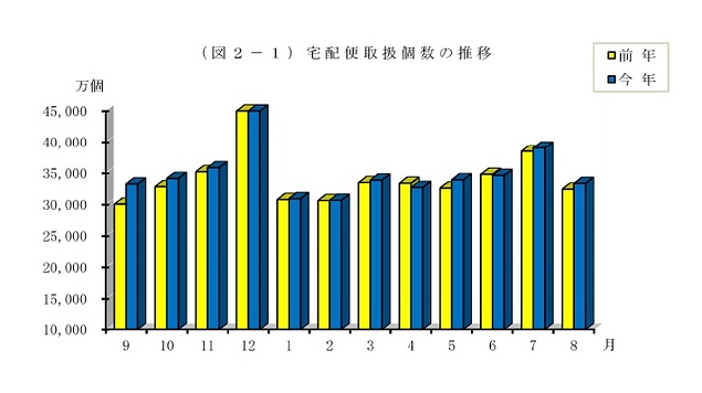調査対象14社の今月の宅配便貨物の取り扱い個数は約3億3,351万1,000個で、前月と比べ 約5,705万8,000個減少し前月比85.4%(季節調整済み101.7%)となり、前年同月との比較では約901万7,000個増加し前年同月比102.8%の実績となった。