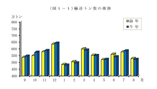 なお、平均稼働日数は22.5日で、前月と比べ1.6日減少し、前年同月との比較では0.2日減少。稼動1日当たりの輸送量は23万1,784tで、前月と比べ約1万1,000t減少し前月比95.5%となり前年同月との比較では約1,000t減少し前年同月比99.6%の実績となった。