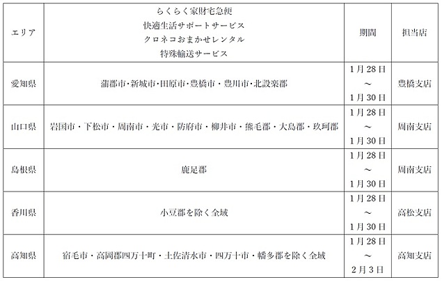 YHCはすでに昨年8月31日からすべての引越サービスの新規受注を休止しているが、今回の行政処分を受け引越以外のサービス「らくらく家財宅急便」、「快適生活サポートサービス」等が地域により利用できない期間が出る。詳細は以下の表の通り。